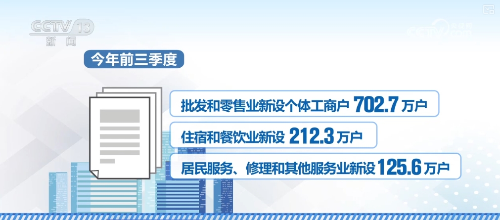 前三季度,批发和零售业新设个体工商户702.7万户,住宿和餐饮业新设212.3万户,居民服务、修理和其他服务业新设125.6万户。