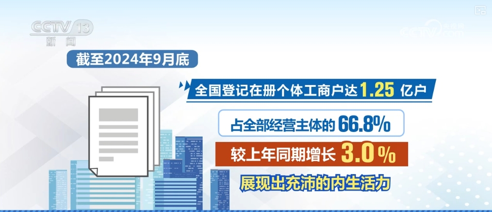 截至2024年9月底,全国登记在册个体工商户达1.25亿户,占全部经营主体的66.8%,较上年同期增长3.0%,展现出充沛的内生活力。