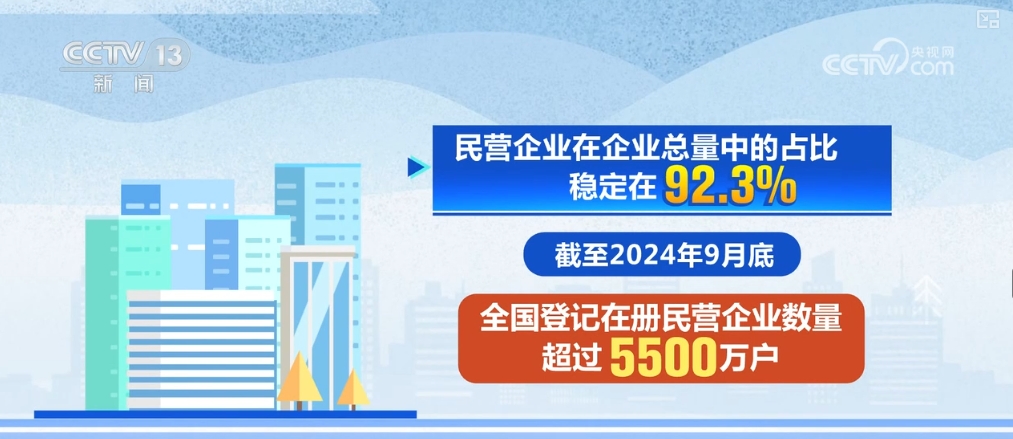 此外,民营企业在企业总量中的占比稳定在92.3%。截至2024年9月底,全国登记在册民营企业数量超过5500万户。