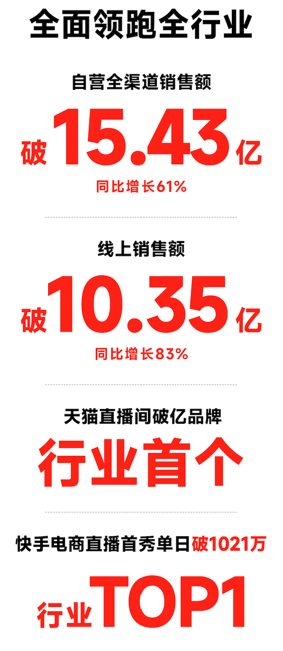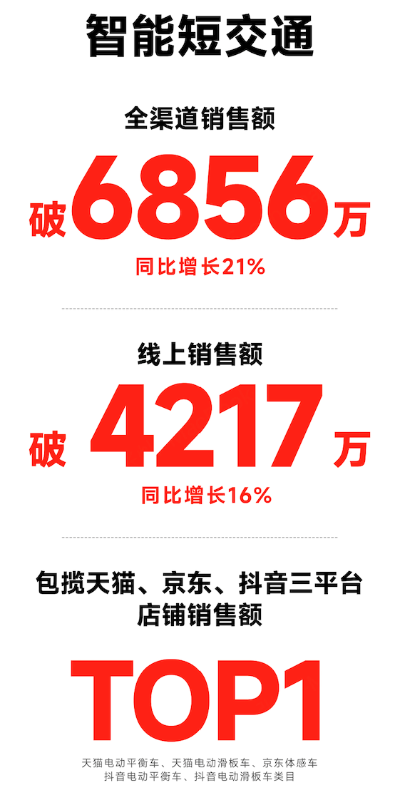作为公司另一大核心业务,包括九号电动滑板车、九号电动平衡车、九号卡丁车等在内的短交通品类,同样大卖。实现全渠道销售额6856万元,同比增长21%,其中线上销售额4217万元,同比增长16%,并包揽天猫、京东、抖音三平台店铺销售额第一。