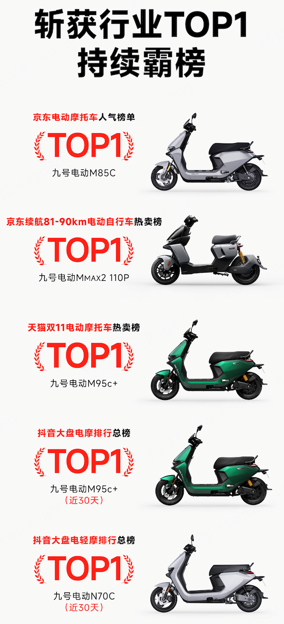 因此,九号公司旗下智能电动两轮车业务在本轮双11期间,实现从智能化到销量表现的持续领跑。10月21日晚8点本轮双11抢先购开启8分钟,九号电动仅天猫销售额便突破2000万元,并推动九号成为本轮双11天猫直播间行业首个店播破亿的品牌。整个双11,九号电动实现全渠道销售额14.74亿元,同比增长63%,其中线上销售额9.9亿元,同比增长88%,并包揽京东、天猫、抖音三平台店铺销售额第一,持续巩固4000元以上价位销售额第一。而在细分热卖车型中,九号电动机械师MMAX 2 110P、九号电动M85C、九号电动M95c 、九号电动N70C等产品,则稳居京东、天猫、抖音三平台电摩、电自细分热卖榜榜首,领跑全行业。