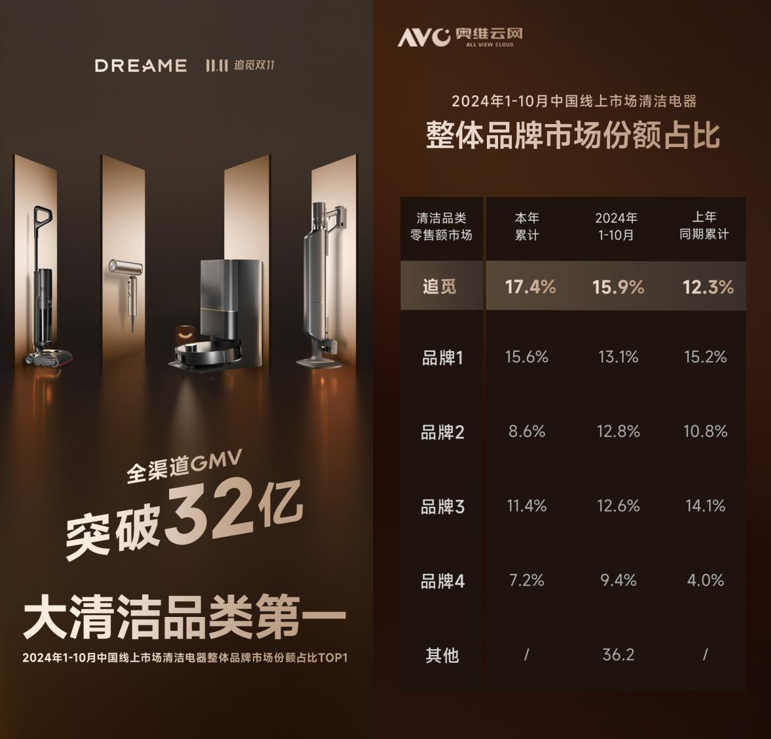 11月12日,追觅科技发布“双11”战报,战报显示,2024年10月1日-11月11日,追觅科技全渠道GMV突破32亿,另根据奥维云网(AVC最新数据显示,2024年1-10月,在中国清洁电器线上市场中,追觅科技零售额占比达15.9%,稳居行业第一,再次刷新纪录。