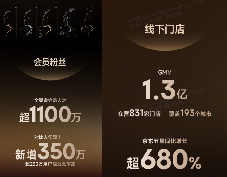 电商平台如火如荼,线下市场也多点开花。本次大促,追觅科技线下在营831家门店,覆盖193个城市,总GMV突破1.3亿,在京东五星销额同比增长超680%,再创新高。同时,全渠道品牌会员人数超1100万人,同比去年双11新增350万人。