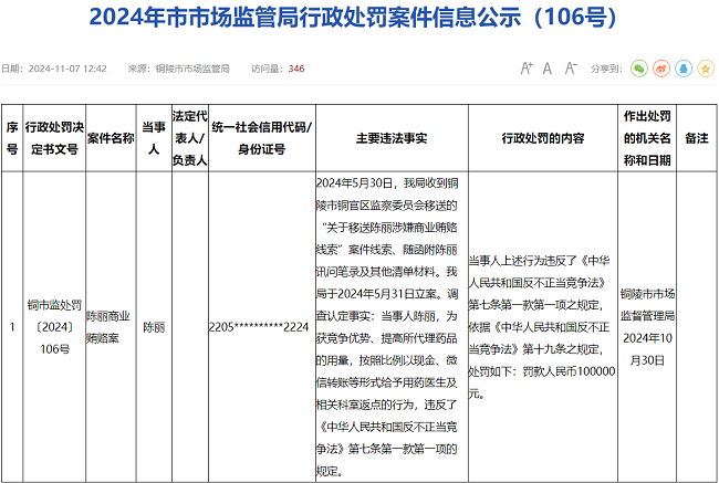 财经11月13日讯 近日,安徽省铜陵市市场监督管理局官网通报了一起医药公司员工商业贿赂案,吉林长龙药业(08049.HK一名医药代表被指向“用药医生及相关科室”提供“返点”,涉嫌商业贿赂,被处以行政处罚。