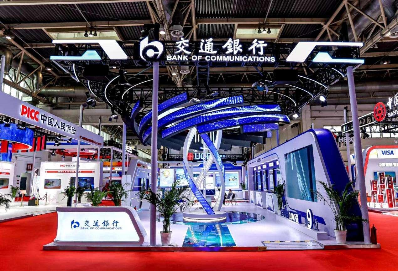 本次展会,交通银行在供应链服务展区(E3馆核心区域设置了153㎡的专属展台,展示区域大面积采用全息投影技术并设置人机交互设备,搭配螺旋式LED动态灯光,以科技感十足的几何线条及光影效果,营造数字化、智能化的视觉空间氛围。高铁动车轮廓造型的弧形区域,聚焦交通银行改革创新历史沿革、做好“五篇大文章”等方面的实践与成果,向社会公众生动展示百年交行全力支持实体经济发展、服务人民美好生活的责任与担当。