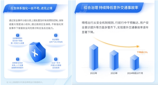 而基于从安全机制规则,行前触达,行中触达,用户安全意识提升等方面的多管齐下,嘀嗒出行已实现意外交通事故率逐年显著下降,2024年前十个月同比2023年下降超15%。