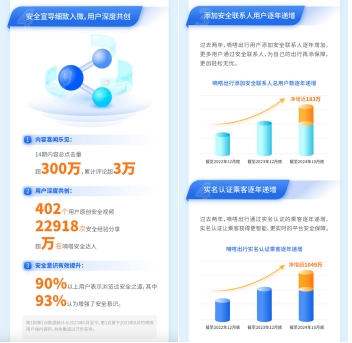 此外,2024年,嘀嗒出行进一步升级夜间出行安全管控,通过安全护航阈值调整,行前二次人脸识别等升级,车主夜间出行开启App及定位录音管控、行前行中全方位心智强化等五大组合拳,让用户夜间出行更无忧。