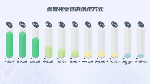 在本次调查的晚期三阴性乳腺癌患者群体中,化疗仍占据主导地位。治疗过程中常见的不良反应,如恶心、呕吐、脱发、疲劳等,不仅严重影响患者的生存质量,还成为影响治疗依从性的重要因素,近七成患者因不良反应萌生放弃治疗的念头。相比之下,尽管免疫治疗、靶向治疗及抗体偶联药物(ADC治疗等创新疗法展现出一定的治疗潜力,但在实际应用的普及上还有很大的提升空间。