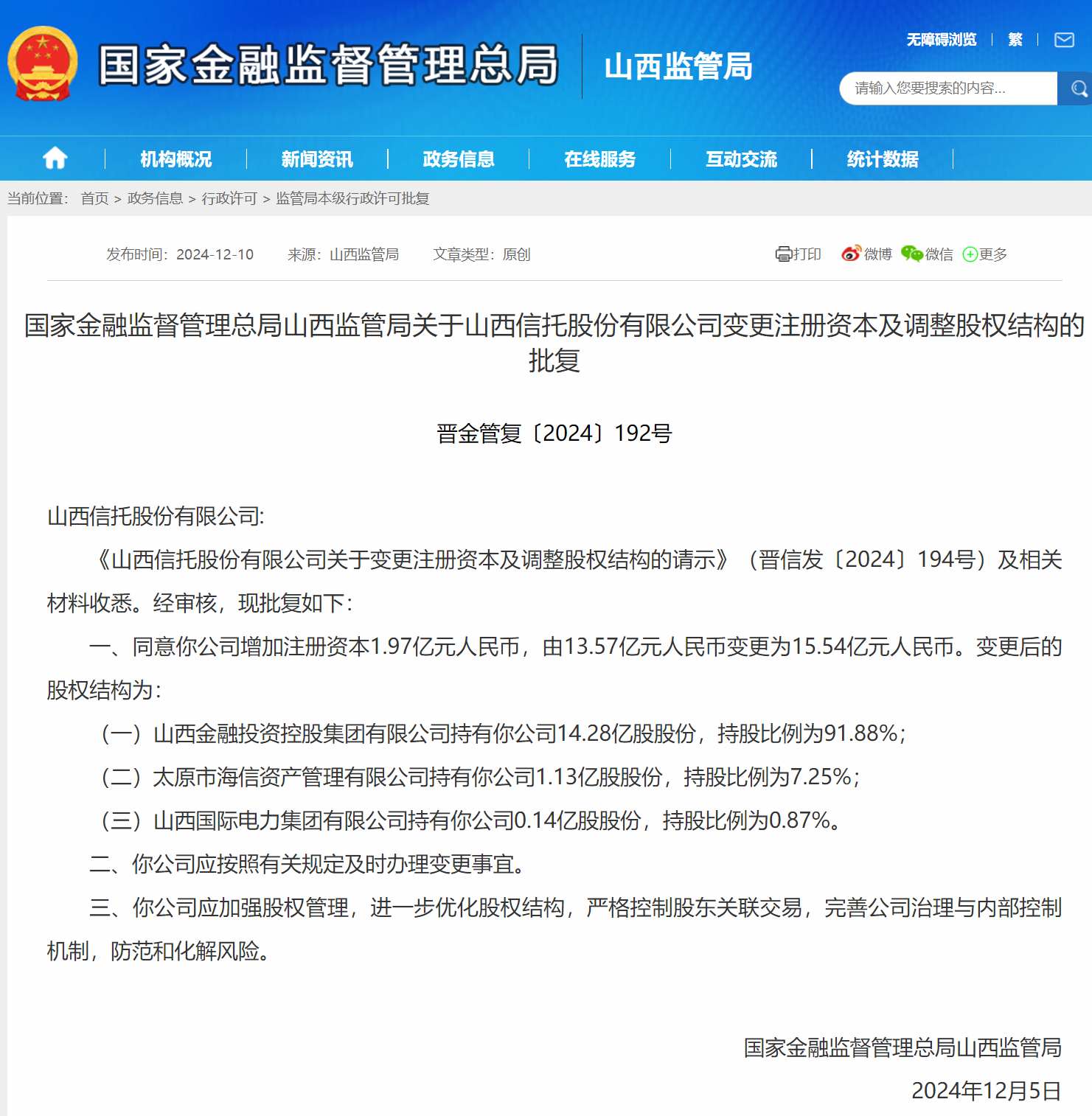 财经12月11日讯 昨日,国家金融监督管理总局山西监管局(简称:山西监管局公布相关批复,同意山西信托股份有限公司(简称:山西信托增加注册资本1.97亿元人民币,由13.57亿元人民币变更为15.54亿元人民币。山西信托变更后的股权结构为: