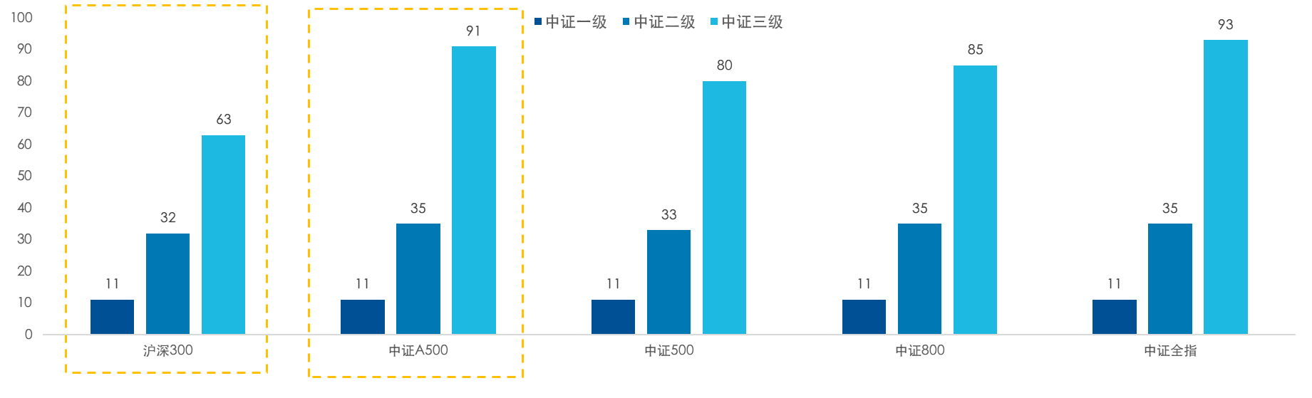 在行业分布上,中证A500指数覆盖了93个中证三级细分行业中的91个,覆盖度广,且分布相对均衡,前三大行业分别为工业(22.1%、金融(14.6%、信息技术(13.1%,超配工业、通信服务、医药、信息技术、原材料、可选消费、公用事业等行业。更多细分龙头成份股聚焦科技制造领域,符合高质量发展方向。