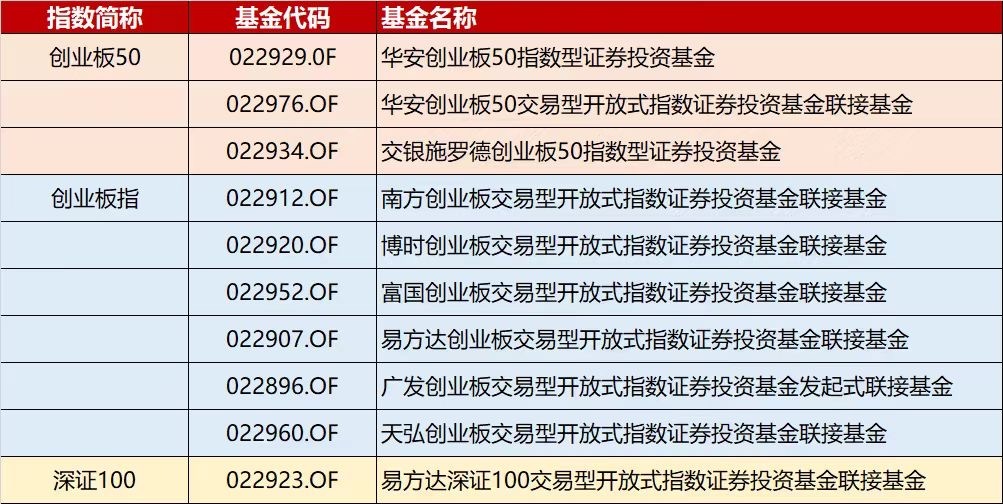 跟踪创业板指的有6只,分别是南方创业板ETF联接、博时创业板ETF联接、富国创业板ETF联接、易方达创业板ETF联接、广发创业板ETF联接、天弘创业板ETF联接。创业板指数是由创业板中市值大、流动性好的100只股票组成,反映创业板市场的运行情况。创业板指数新兴产业、高新技术企业占比高,成长性突出,兼具价值尺度与投资标的的功能。