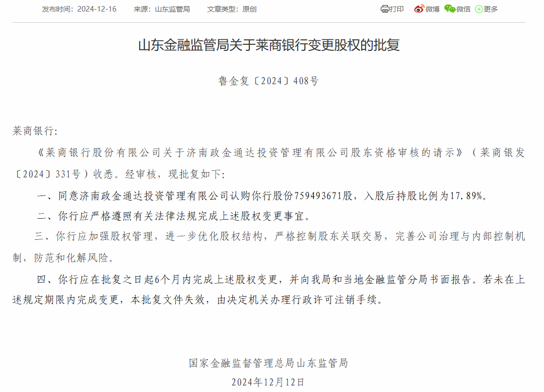 济南政金通达投资管理有限公司获准认购莱商银行股份7.59亿股 更新时间:2024-12-17 11:21:36 •阅读 0 财经12月17日讯 昨日,山东金融监管局披露批复显示,山东金融监管局同意济南政金通达投资管理有限公司认购莱商银行股份759493671股,入股后持股比例为17.89%。