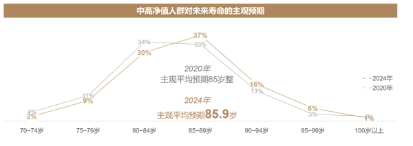 我国卫生健康事业发展统计公报 2023 年数据显示,人均预期寿命为 78.6 岁。然而,中高净值人群主观上认为自己能达到的寿命预期已提升至 85.9 岁,较五年前增长近一岁。更有接近四分之一的中高净值人士认为未来寿命极有可能超过 90 岁。可见,百岁人生正成为中高净值人群规划生命长度的重要考量。