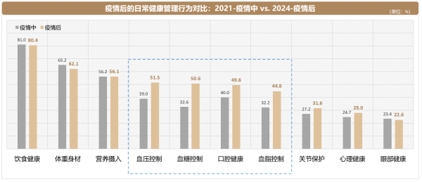 对比疫情前后数据,《白皮书》发现饮食、体重、营养始终是中高净值人群进行日常健康管理的关键要素。同时,控制血压、血糖、血脂,避免出现 “三高”,成为中高净值人群的新关注点,相较 2021 年占比明显提升。特别是血压和血糖,已有半数中高净值人群会有意识地进行监控和管理。此外,注重口腔健康的中高净值人群占比也提升了近 10 个百分点,同样成为半数中高净值人群的日常健康管理行为之一。在饮食、体重、营养达标的前提下,对血压、血糖、血脂和口腔的管理成为中高净值人群迈向健康百岁人生的行动方案。