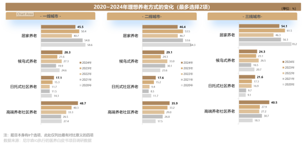 作为国家倡导的 “9073” 养老模式,占比 90% 的居家养老方式,在中高净值人群的选择偏好中呈下降趋势。特别是在一线城市,48.7% 的中高净值人群将高端养老社区视为最理想的养老方式之一,该比例首次超越对居家养老的偏好(45.5%。在二三线城市,虽然居家养老仍占主流,但偏好高端养老社区的中高净值人群比例也创下新高。同时,中高净值人群对候鸟式养老、日托式社区养老等养老方式的接受程度亦呈上升态势。未来,更加多元、丰富的养老形态将持续进入中高净值人群的视野。