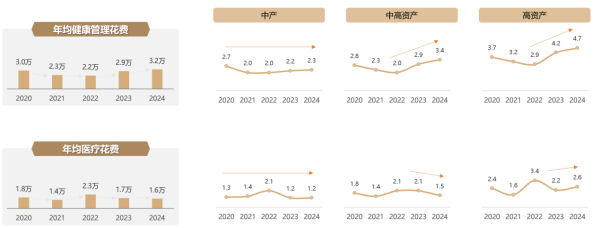 通过对每年健康管理和医疗花费的追踪,《白皮书》发现中高净值人群将更多支出投入到健康管理中。尤其以 2022 年为分水岭,历经三年疫情洗礼后,中高净值人群的健康管理支出持续回升,超越疫情前水平,而医疗花费则略有下降。其中,除中低收入人群在健康和医疗方面的投入相对稳定外,中高收入人士及高资产人士在健康管理方面的金额投入均呈直线上升趋势,高资产人士每年的健康管理花费接近 5 万元。更加注重常态化的健康管理,已成为中高净值人群的新风尚,亦是保障以强健体态迈入长寿时代的基础。