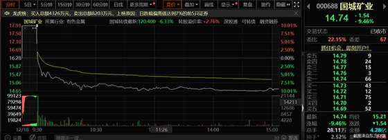 筹划重大资产重组的消息披露后,国城矿业遭遇投资者“用脚投票”。交易行情显示,12月18日,国城矿业小幅高开1.97%,开盘后公司股价震荡下探,盘中翻绿,最低触及跌停价14.65元/股,截至收盘,国城矿业收跌9.46%,报14.74元/股,总市值约为164.7亿元。
