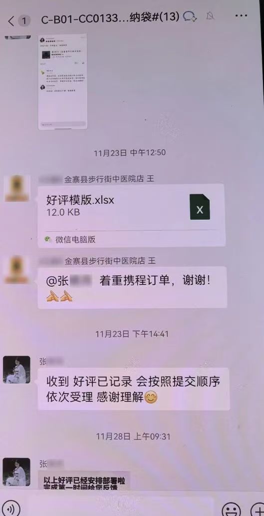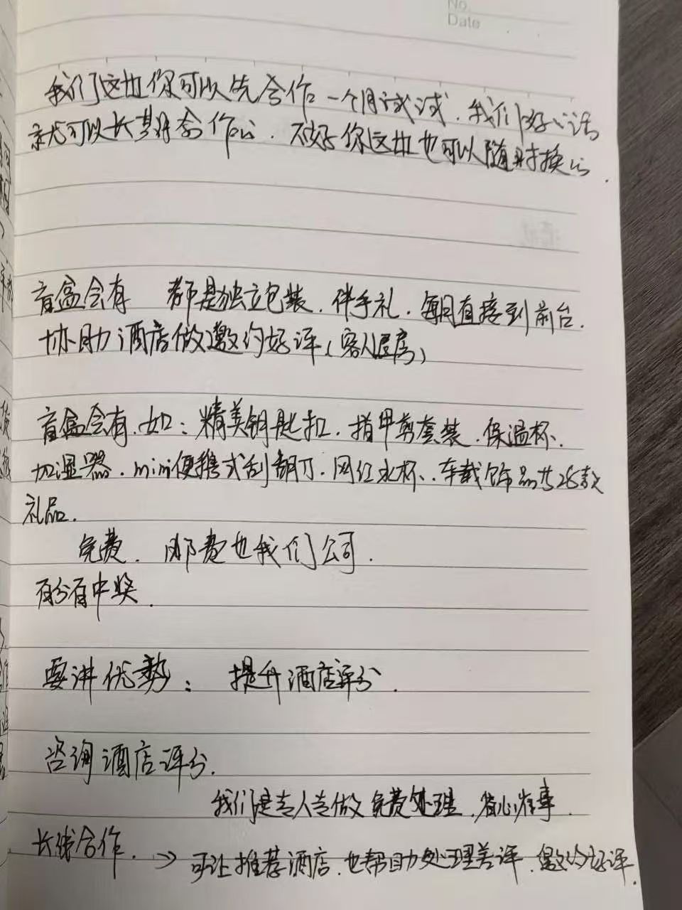 施伟:如果宾旅馆专门组织人手或者委托其他公司去做“好差评”管控,付出的成本是非常高的。既然涉案公司免费提供这项服务,对于宾旅馆来说,这是“互惠互利”的行为,所以他们每个月通过制表、手抄、翻拍以及后台系统导出等方式,向该公司定时定量提供住客姓名、入住时间以及联系方式。