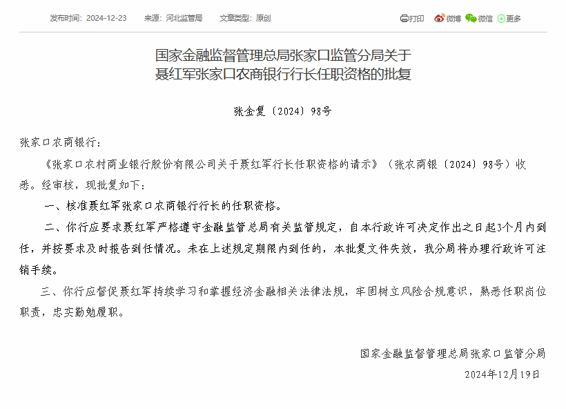 张家口农商银行行长聂红军任职资格获批 更新时间:2024-12-23 18:21:38 •阅读 0 财经12月23日讯 今日,国家金融监督管理总局网站显示,国家金融监督管理总局张家口监管分局核准聂红军张家口农商银行行长的任职资格。