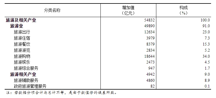 从内部构成看,旅游业增加值为49890亿元,占旅游及相关产业增加值比重为91.0%,比上年提高1.7个百分点。旅游相关产业增加值为4942亿元,占旅游及相关产业增加值比重为9.0%,比上年下降1.7个百分点。