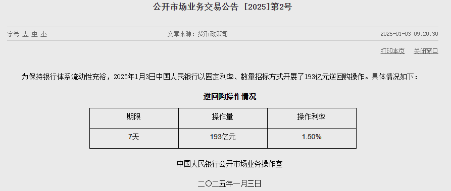 央行今日开展193亿元7天期逆回购操作 更新时间:2025-01-03 11:21:42 •阅读 0 财经1月3日讯 今日,中国人民银行网站显示,为保持银行体系流动性充裕,2025年1月3日中国人民银行以固定利率、数量招标方式开展了193亿元逆回购操作。操作利率为1.50%。