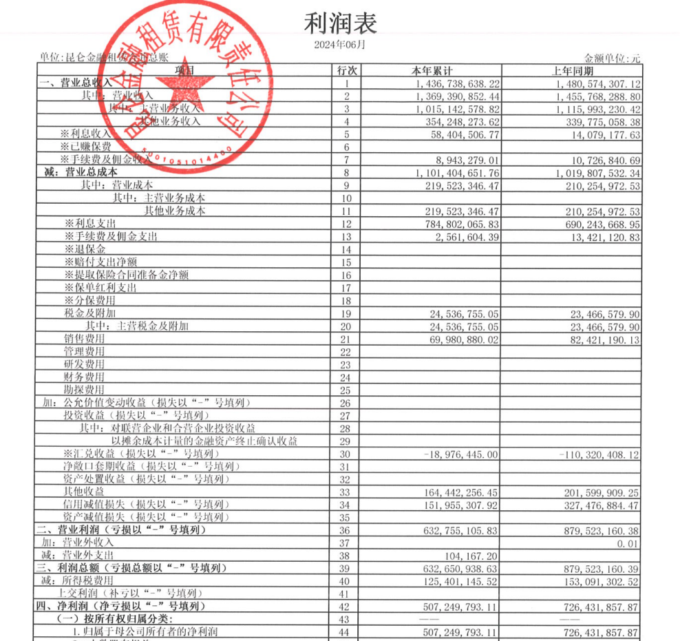 去年7月,中油资本发布昆仑金租等2024年上半度未经审计财务报表显示,上半年昆仑金租实现营收14.37亿元,实现净利5.07亿元。其中,昆仑金租2024年上半年主营收入为10.15亿元。资产方面,昆仑金租资产规模出现小幅上升,期末达714.08亿元。