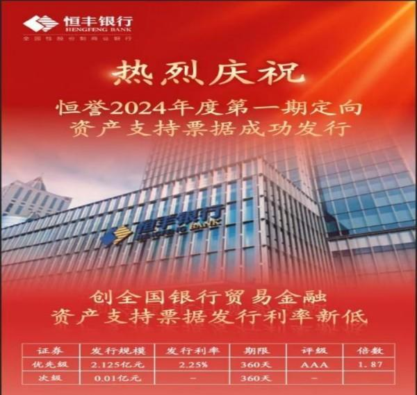 近日,由恒丰银行作为发起机构代理人的“恒誉”2024年度第一期贸金资产支持票据在银行间市场交易商协会成功发行,发行规模2.135亿元,债项评级AAAsf,优先级资产票面利率2.25%,发行倍数1.87倍。本期“恒誉”项目是全国今年首单实现分离式保函项下的资产转让类项目,创全国银行间市场贸易金融资产支持票据发行利率新低。