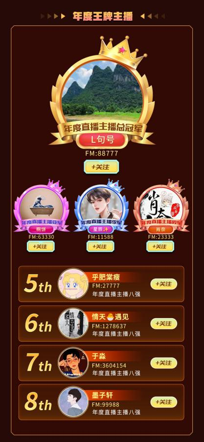 据悉,从去年12月1日开始,声典活动陆续举办VIP荣耀之巅、年度优质家族、年度主播赛、年度播客评选等重磅大赛,涉及直播、播客等全品类内容。