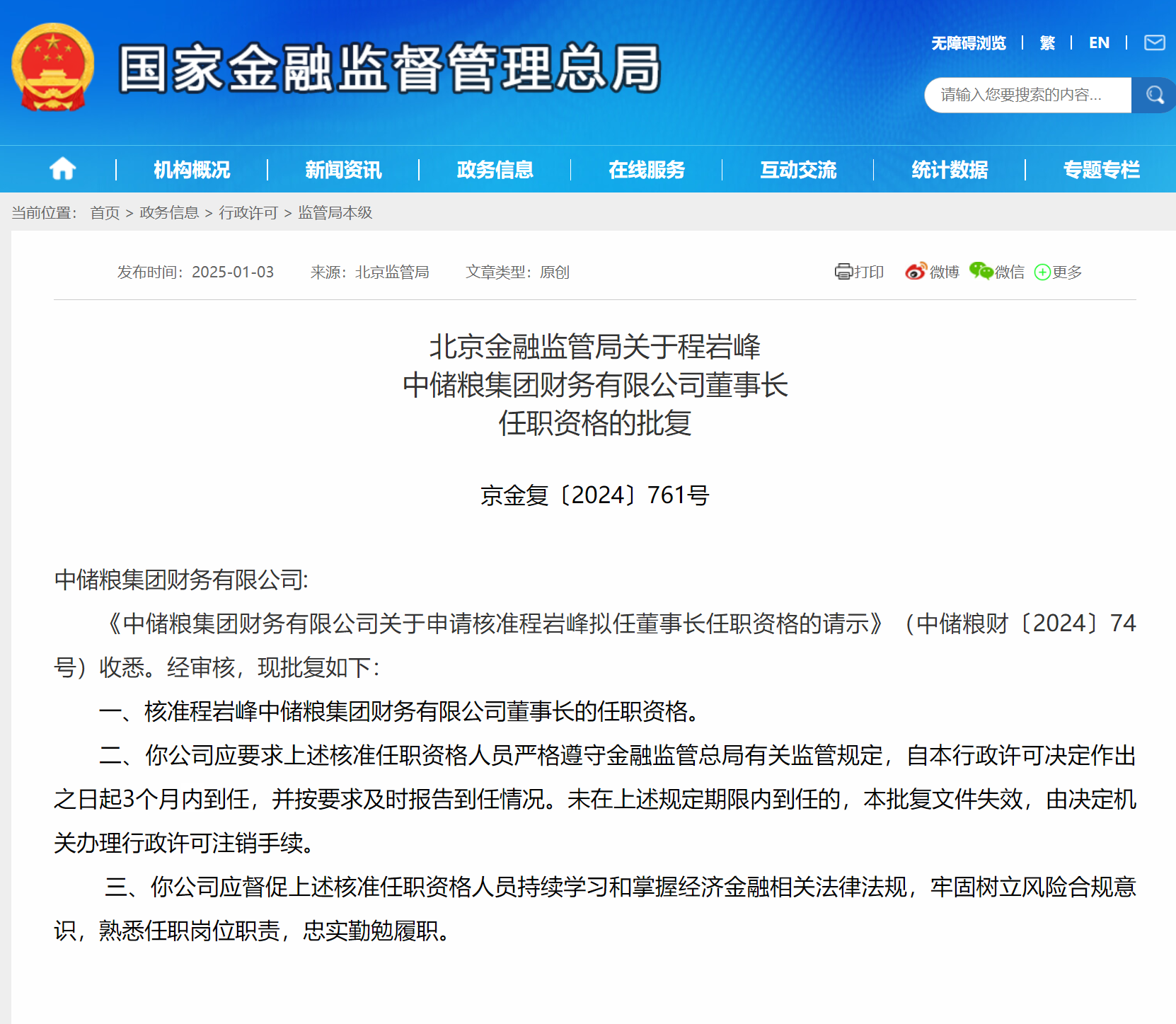 程岩峰获批担任中储粮财务公司董事长 更新时间:2025-01-03 18:21:31 •阅读 0 财经1月3日讯 今日,北京金融监管局公布相关批复,核准程岩峰中储粮集团财务有限公司(简称“中储粮财务公司”董事长的任职资格。以下是相关批复正文: