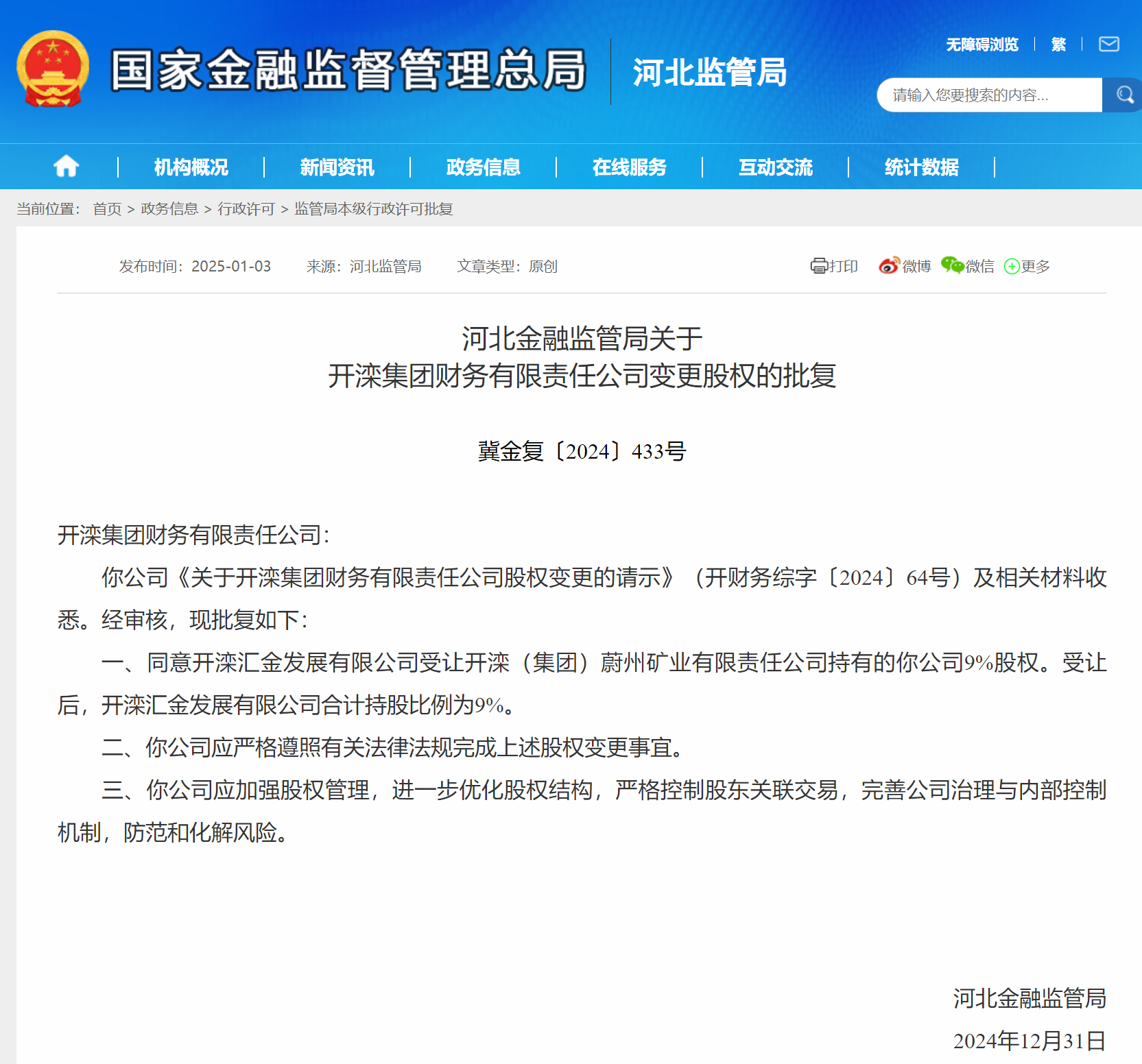 开滦集团财务公司股权变更获批 开滦汇金发展新增持股比例9% 更新时间:2025-01-06 10:22:12 •阅读 0 财经1月6日讯 日前,河北金融监管局公布相关批复,同意开滦汇金发展有限公司受让开滦(集团蔚州矿业有限责任公司持有的开滦集团财务有限责任公司(简称“开滦集团财务公司”9%股权。受让后,开滦汇金发展有限公司(简称“开滦汇金发展”)合计持股比例为9%。以下是相关批复正文: