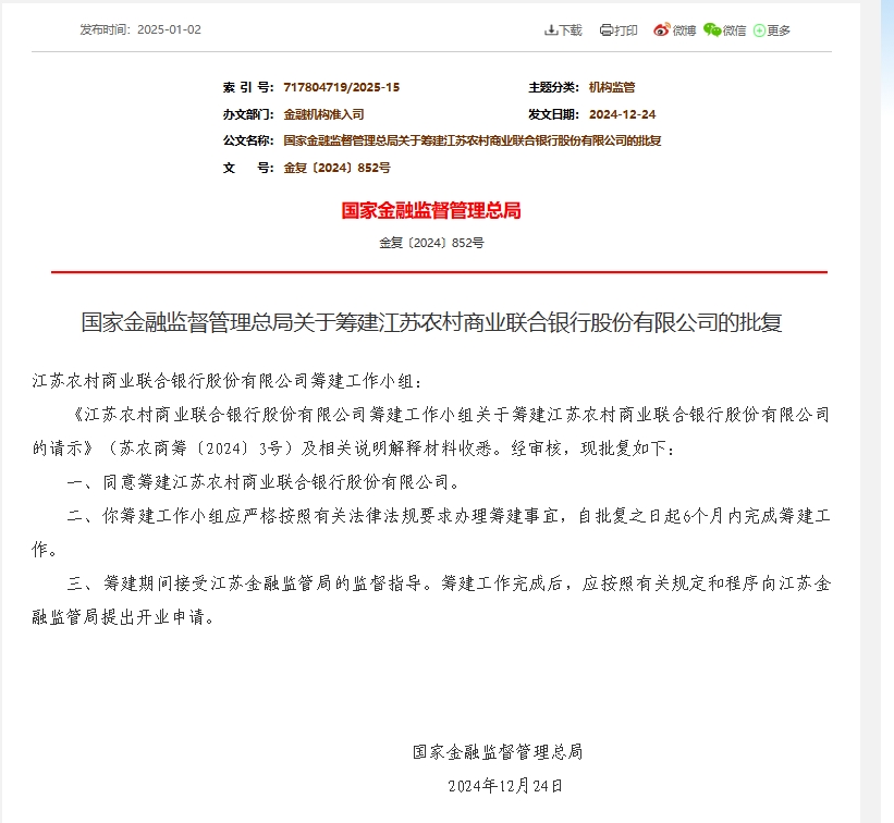 江苏农商联合银行获批筹建 更新时间:2025-01-06 11:21:45 •阅读 0 财经1月6日讯 近日,国家金融监督管理总局公布批复显示,同意筹建江苏农村商业联合银行股份有限公司。批复显示,江苏农村商业联合银行股份有限公司筹建工作小组应严格按照有关法律法规要求办理筹建事宜,自批复之日起6个月内完成筹建工作。筹建期间接受江苏金融监管局的监督指导。筹建工作完成后,应按照有关规定和程序向江苏金融监管局提出开业申请。