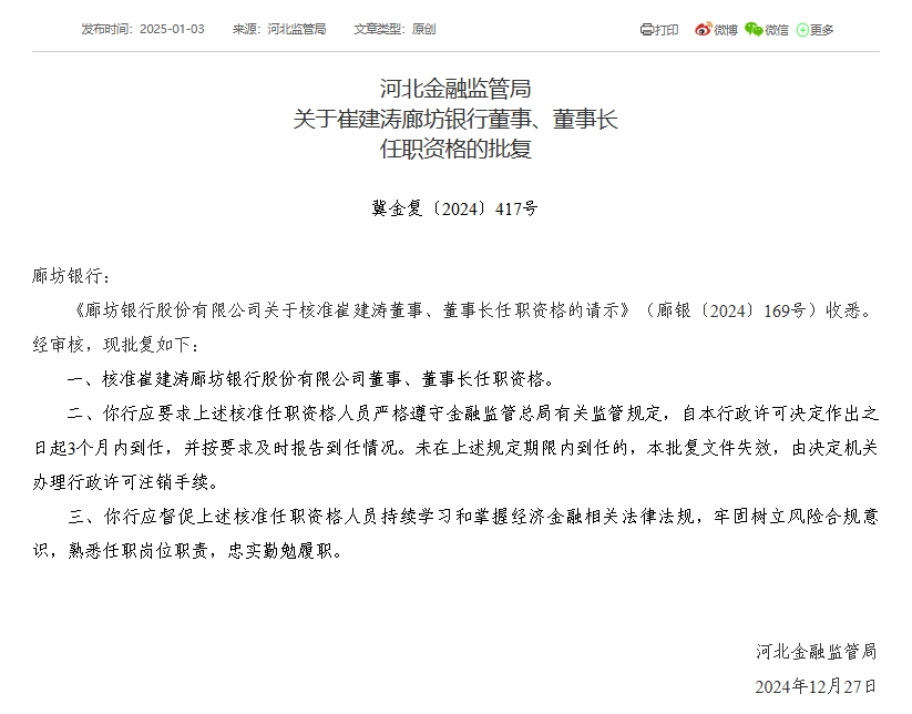 财经1月6日讯 近日,河北金融监管局公布批复显示,核准崔建涛廊坊