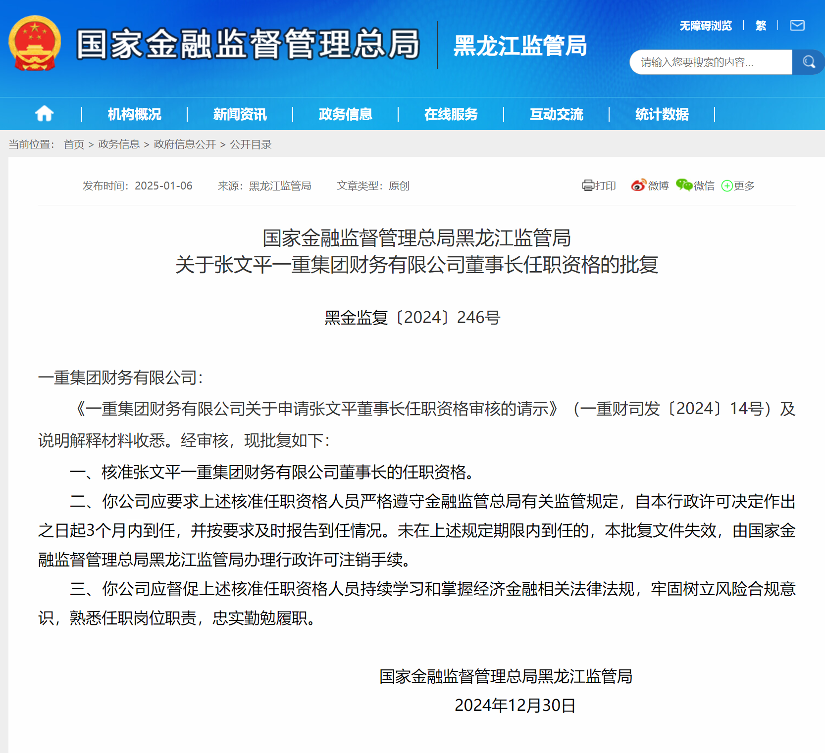 张文平获批担任一重集团财务公司董事长 更新时间:2025-01-06 12:21:10 •阅读 0 财经1月6日讯 今日,国家金融监督管理总局黑龙江监管局公布相关批复,核准张文平一重集团财务有限公司(简称“一重集团财务公司”董事长的任职资格。以下是相关批复正文: