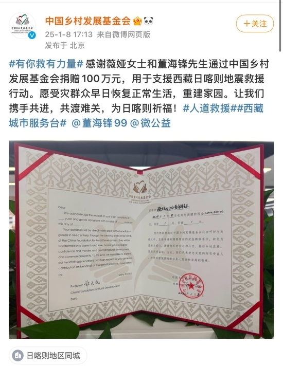 为了帮助受灾地区早日渡过难关、恢复正常生产生活。1月8日,薇娅、董海锋夫妇向中国乡村发展基金会捐赠100万元资金,善款将用于支援西藏日喀则地震救援行动。