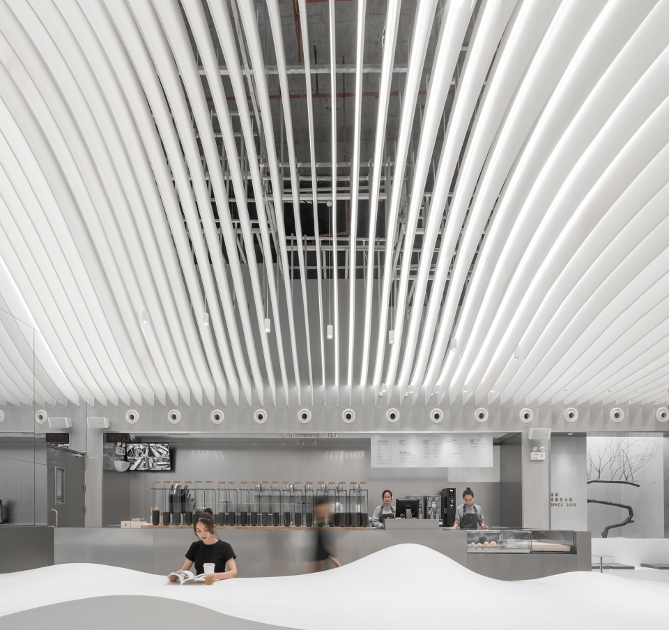 从人文茶事中提取空间元素,喜茶DP店对中式茶文化的禅意进行了再现。深圳深业上城DP店“山溪间·找茶趣”就在王羲之的《兰亭集序》中汲取灵感,将古人围溪而坐品茗畅谈的茶事场景搬进喜茶空间,还原“流觞曲水”的中式意境;而广州凯华国际DP店以“山外山”为题,摒弃了普通茶饮空间散落的空间布局,以一张贯穿门店的长桌将茶客们聚合,不规则隆起形似山峦的桌面又将茶客分隔,形式上近似东方意象中的层云叠嶂,置身其中如同身处宋代画家米芾《春山瑞松图》所描绘的云间茶山,中国古典山水的禅意与现代茶事交融其间。