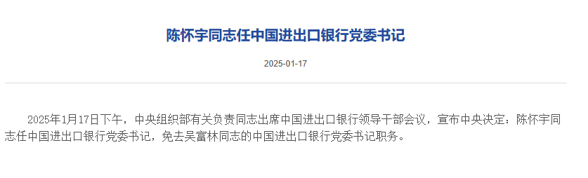 陈怀宇任中国进出口银行党委书记 更新时间:2025-01-17 18:21:18 •阅读 0 财经1月17日讯 今日,中国进出口银行网站显示,2025年1月17日下午,中央组织部有关负责同志出席中国进出口银行领导干部会议,宣布中央决定:陈怀宇任中国进出口银行党委书记,免去吴富林的中国进出口银行党委书记职务。 张紫祎