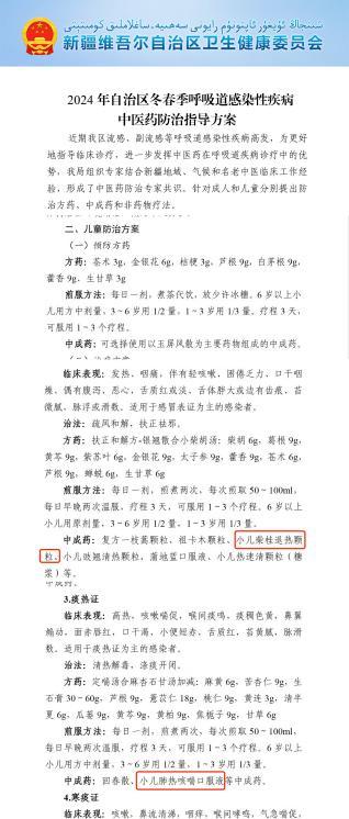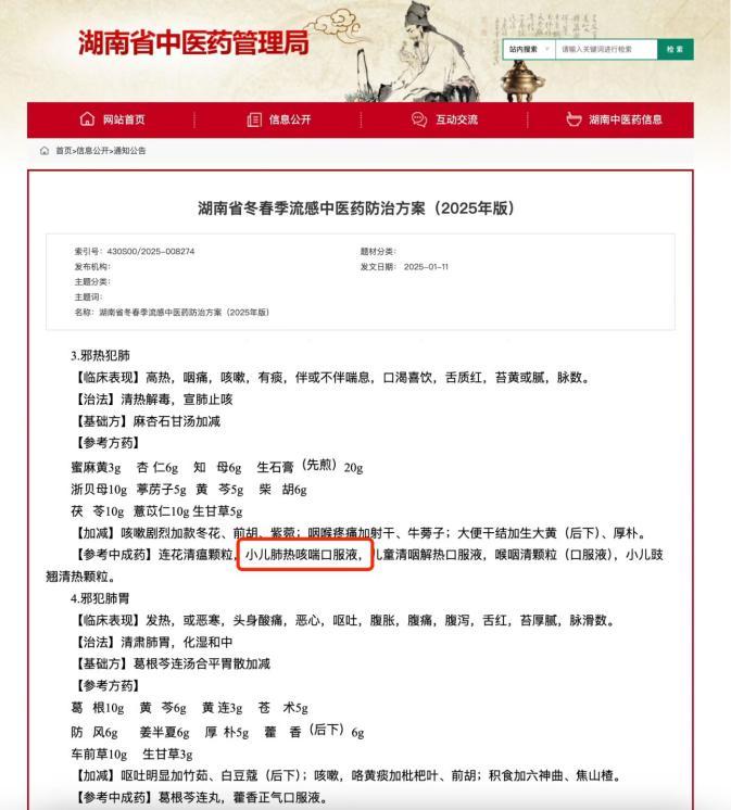 在医疗资源紧张的情况下,像小儿肺热咳喘口服液这样适用于儿童咳嗽、痰热、清热解毒的中成药,受到多省流感防治指南的推荐,给家长提供了科学用药指导。诸如山东省卫健委发布的《山东省冬春季呼吸道感染性疾病中医药防治方案(2024~2025年》、北京市流感专家组制定的《2024年北京市冬季流感中医药防治方案(试行》,以及《湖南省冬春季流感中医药防治方案(2025年版》和《2024年自治区冬春季呼吸道感染性疾病中医药防治指导方案》等均提到,在儿童痰热证情况下,出现高热、咳嗽、咽痛、目赤红、苔黄或腻等症状,可根据辨证论治的原则选用小儿肺热咳喘口服液等中成药。
