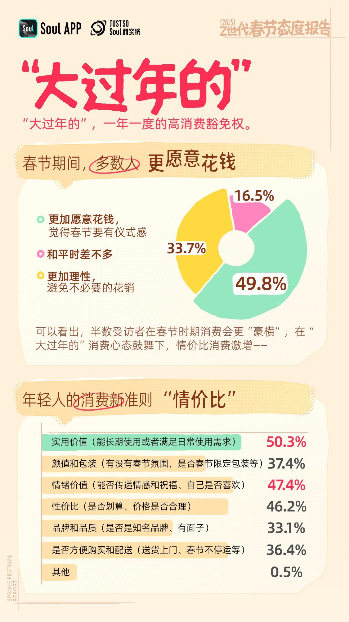 春节是消费旺季,年轻人在春节期间的消费行为也值得关注。报告显示,半数受访者在春节时期消费会更“豪横”,在“大过年的”这一年一度的高消费豁免下,人们“情价比”消费激增。在春节购物的挑选标准中,情绪价值已经成为和实用价值同等重要的首选考虑因素。
