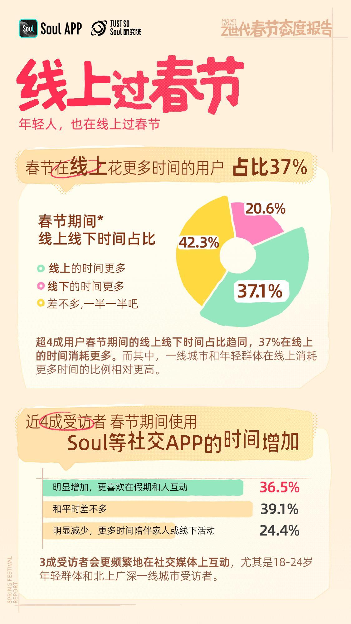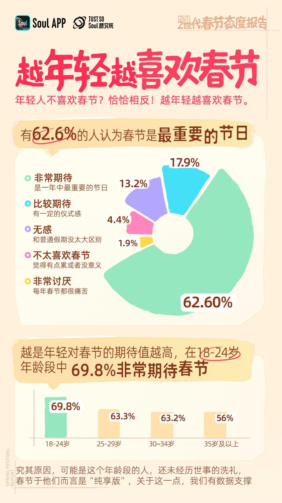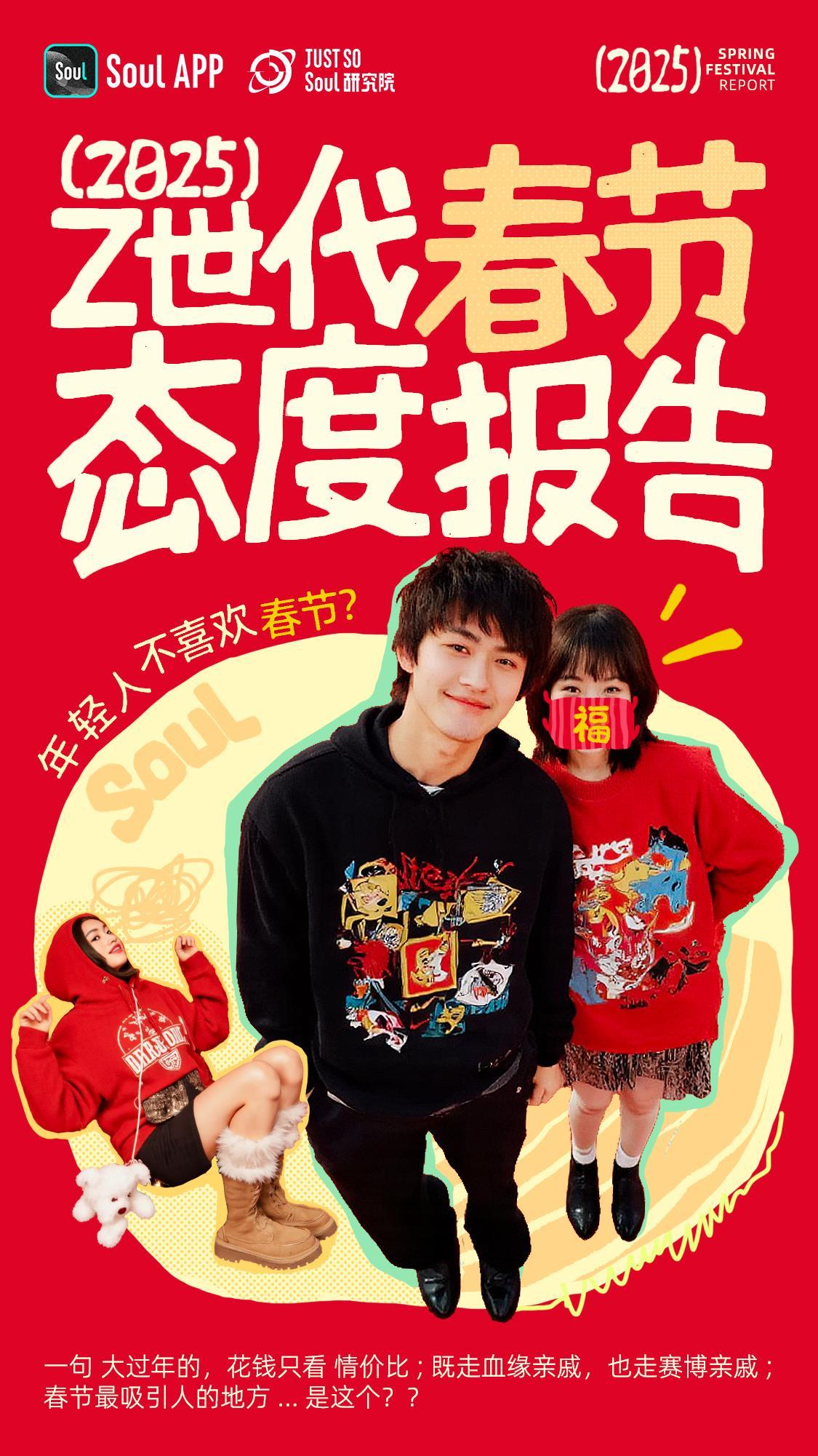 2025年1月,Soul App旗下Just So Soul研究院发布《2025 Z世代春节态度报告》,通过对5695位用户的调研,深入剖析了如今年轻人对春节的独特态度和行为习惯,揭示他们在传统节日中展现出的新活力与新趋势。
