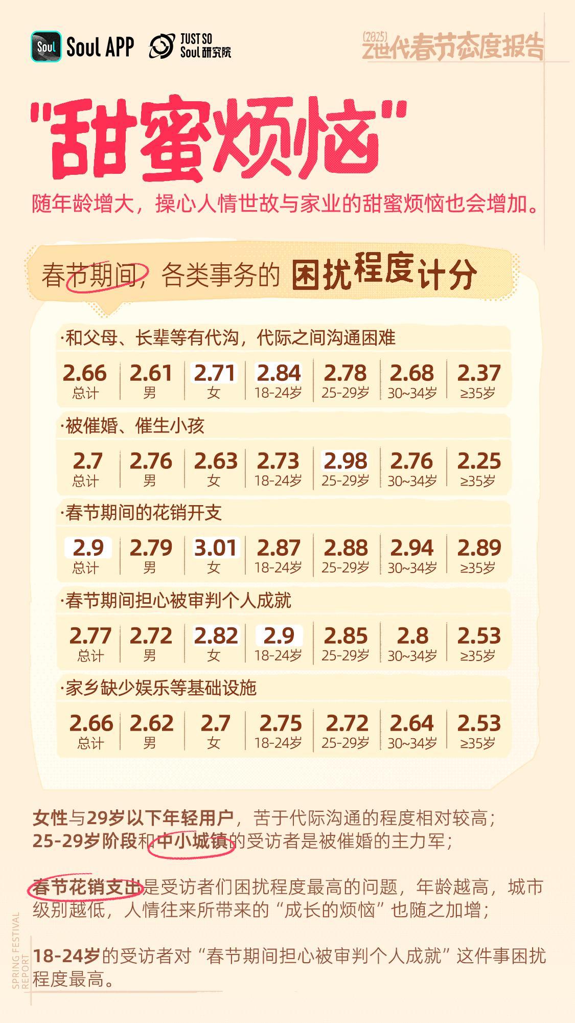 催婚问题也是春节期间年轻人面临的一大困扰。报告发现,25-29岁年龄段以及中小城镇的受访者是被催婚的“主力军”。在传统观念中,春节是一个家庭团聚的时刻,长辈们往往会在这个时候对年轻人的婚姻问题进行“审视”和“督促”。这种催婚行为虽然源于长辈对年轻人的关心,但对于年轻人来说,却可能带来一定的心理压力。