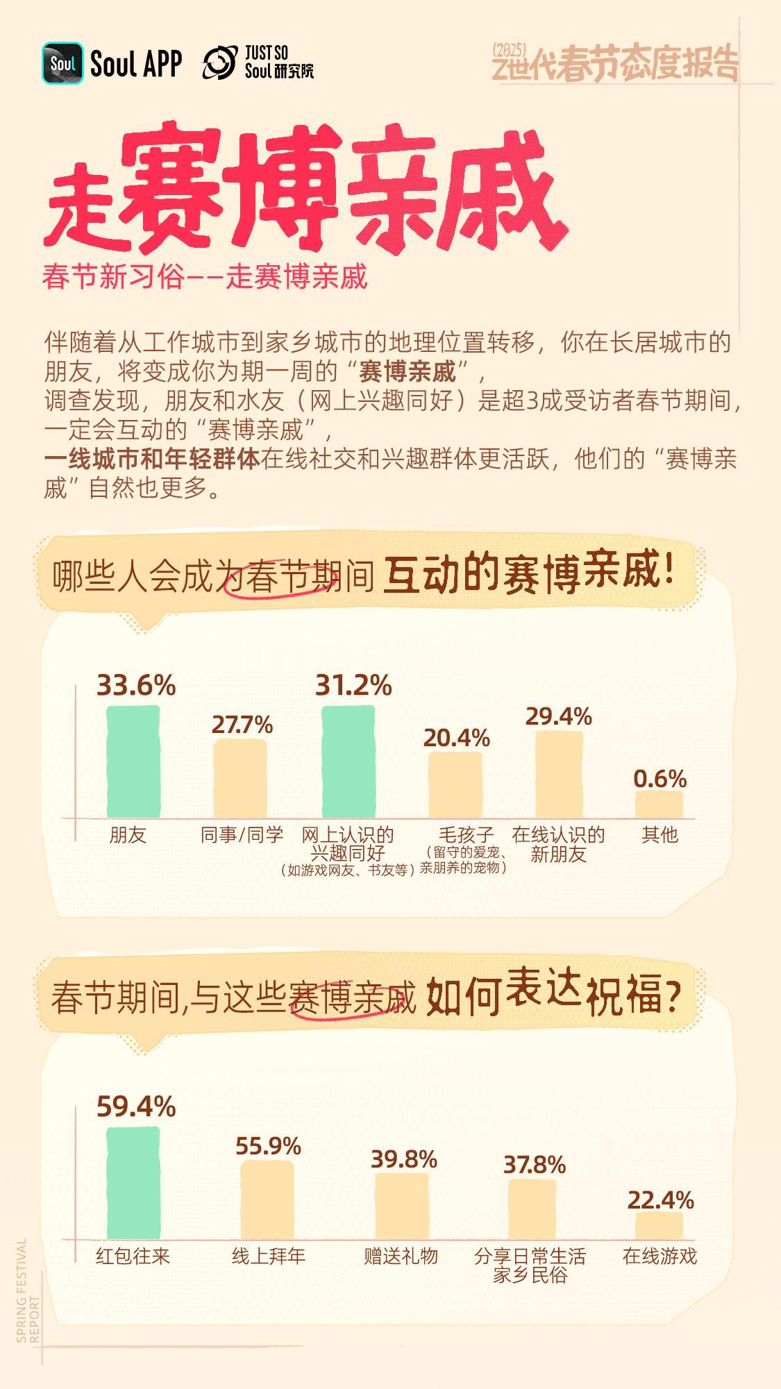 报告中提出了一个有趣的概念——“赛博亲戚”。随着年轻人从工作城市回到家乡城市,他们在长居城市的朋友和兴趣同好变成了春节期间的“赛博亲戚”。这些“赛博亲戚”成为了年轻人春节期间互动的重要对象,他们通过红包往来和线上拜年等方式维系关系,这种传统民俗的线上应用也正契合了“赛博亲戚”的氛围感。