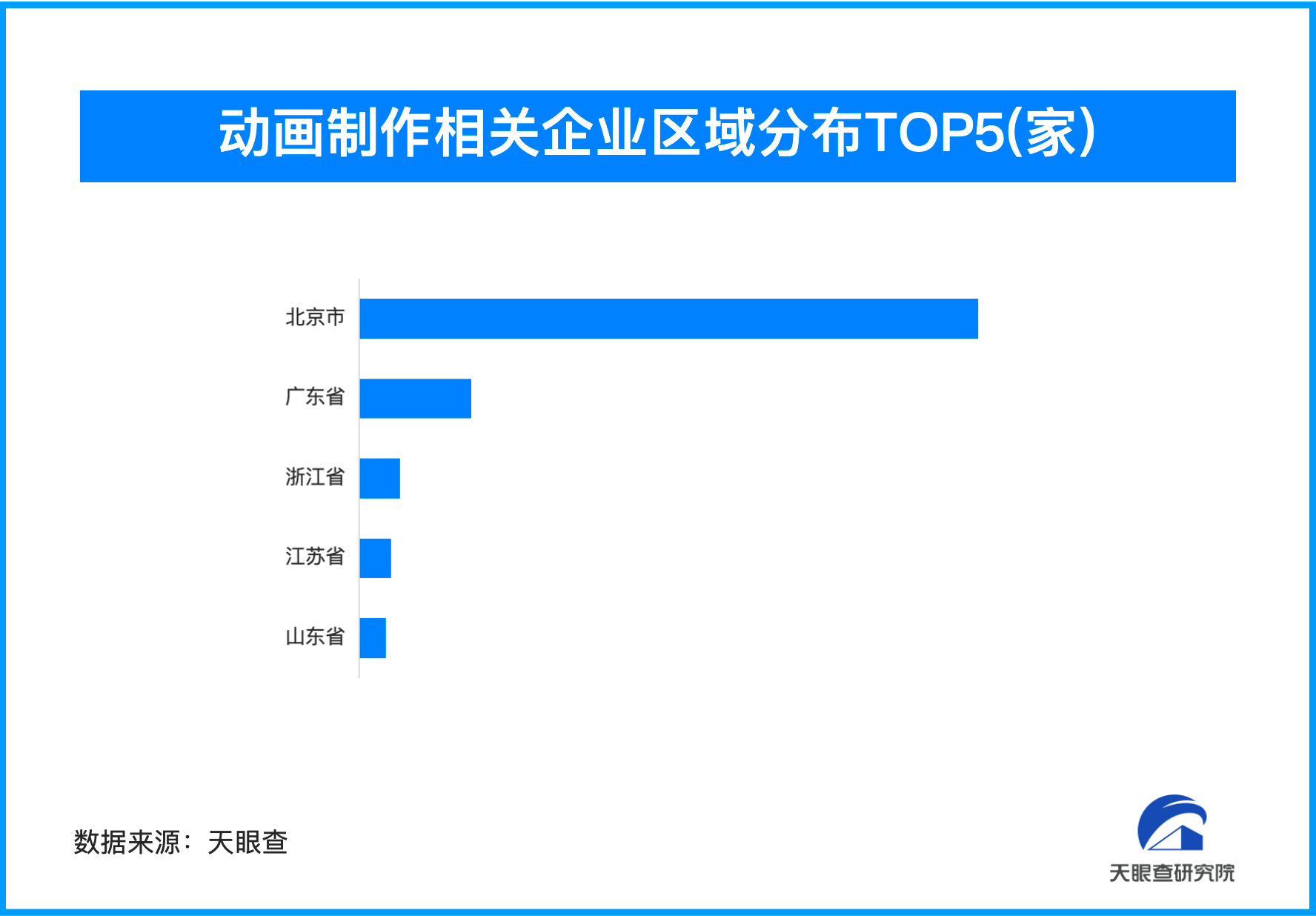 从地域分布看,北京市以10.5万余家动画制作相关企业位居榜首,广东省位居第二,拥有1.9万余家相关企业,浙江、江苏、山东紧随其后,企业数量均超过4500家。
