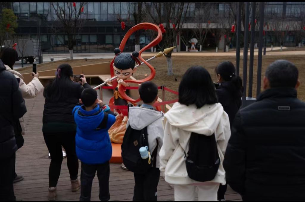 高达5米的哪吒、憨态可掬的太乙真人、清秀俊逸的龙王太子敖丙……作为“哪吒”的诞生地,在成都高新区交子大道,《哪吒2》动画电影中的人物雕塑吸引了众多市民游客驻足打卡。