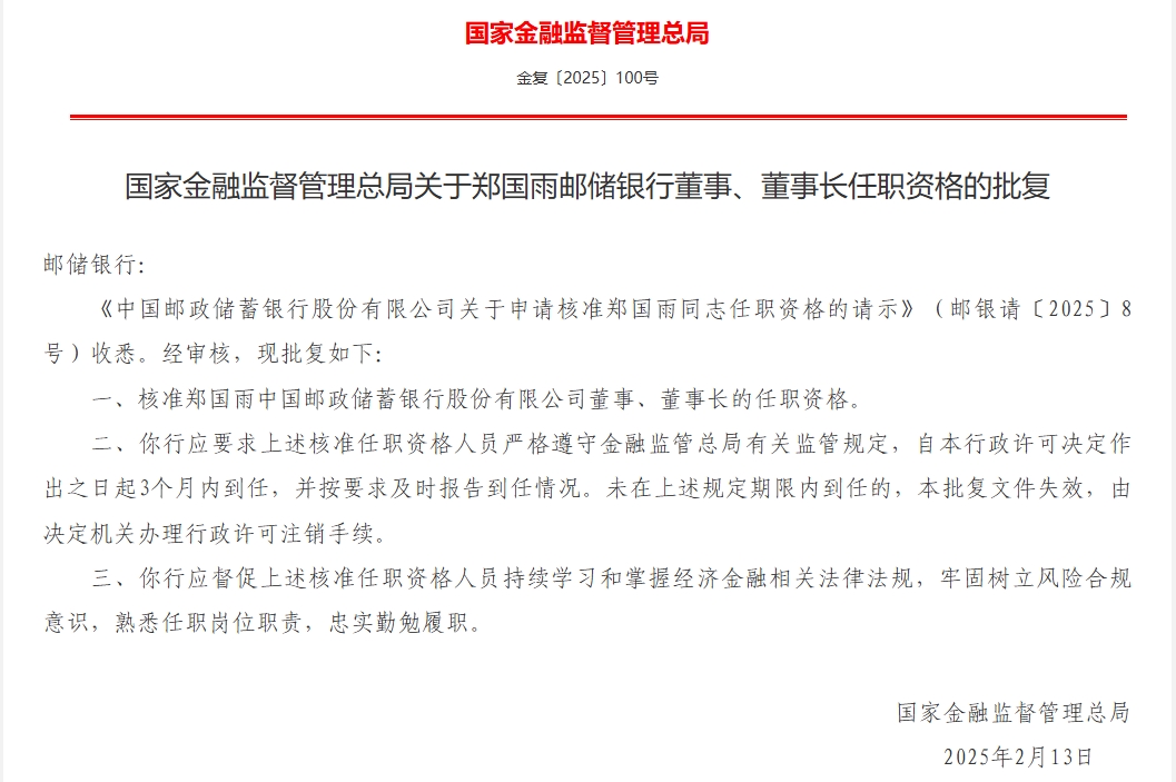 邮储银行董事长郑国雨任职资格获批 更新时间:2025-02-17 12:21:22 •阅读 0 财经2月17日讯 近日,国家金融监督管理总局发布任职资格批复显示,核准郑国雨中国邮政储蓄银行股份有限公司董事、董事长的任职资格。