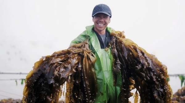 养殖户手捧新鲜捕捞的海带苗,收获颇丰