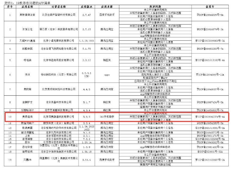 财经3月12日讯 近日,北京市通信管理局发布了关于问题APP的通报(2025年第二期)。通信管理局在通报中表示,通过抽测发现北京部分APP存在侵害用户权益和安全隐患类问题。截至目前,尚有19款APP未整改或整改不到位,现予以公开通报。 通报显示,美易借钱APP因涉三大问题而位列通报名单,三大问题分别是未公开收集使用权利,未明示收集使用个人信息的目的及方式和范围、违反必要原则收集个人信息 。