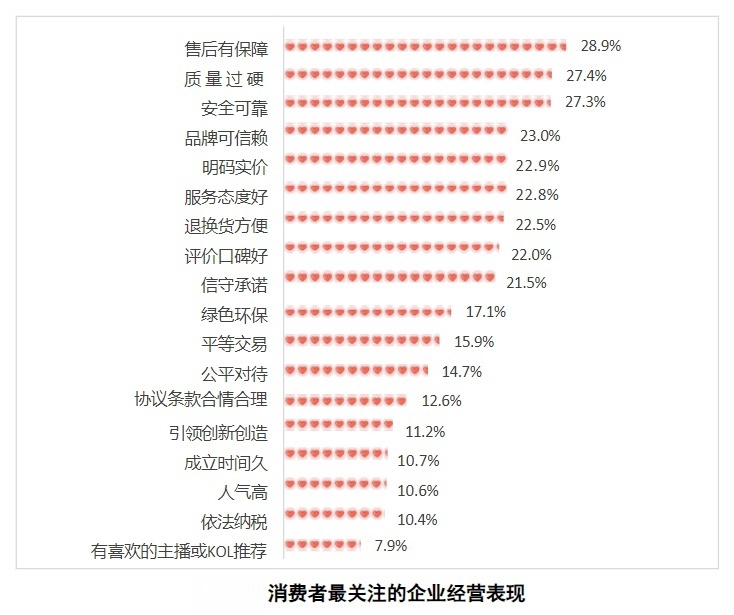 从消费者最关注的企业经营表现来看,“售后有保障”依旧是焦点所在,受访人群占比达28.9%,高居首位。对于“有喜欢的主播或KOL(关键意见领袖推荐”的关注度占比仅为7.9%。