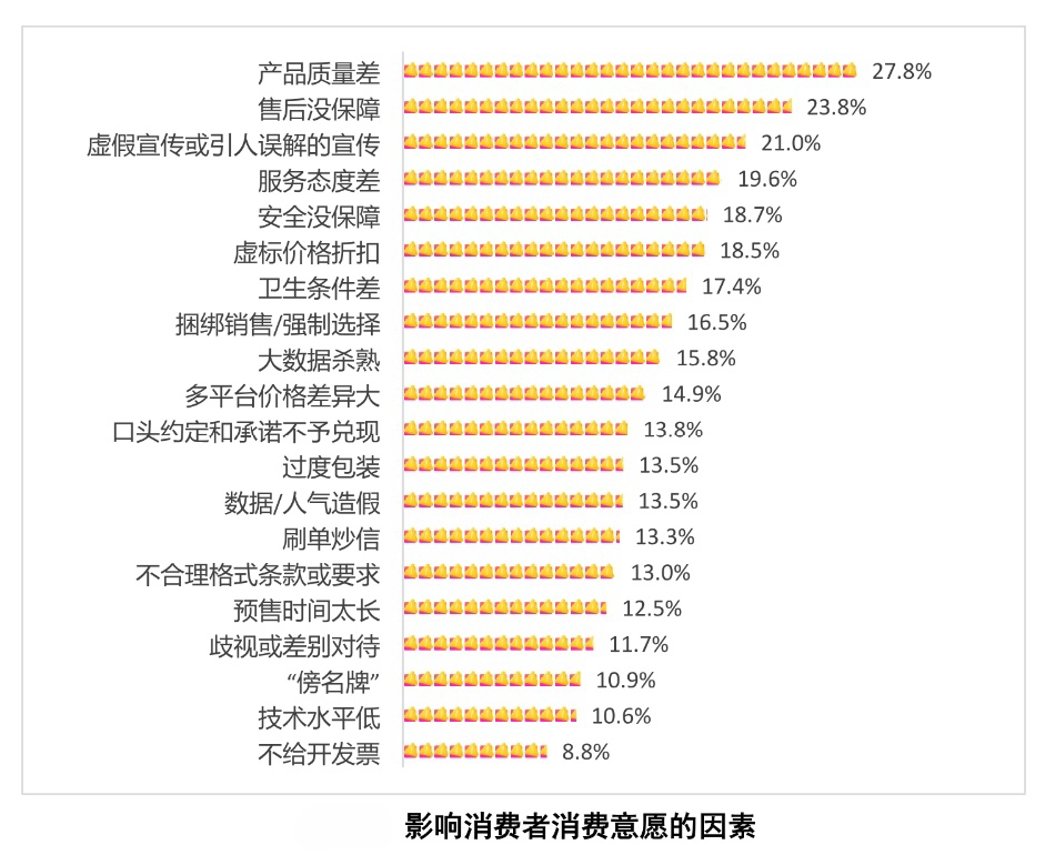 对于调查报告中体现出的消费乱象,中消协有关负责同志指出,虚假宣传或引人误解的宣传、个人信息泄露、价格虚高、假冒伪劣等问题仍持续困扰消费者,应当重点加强治理。(文中图表由中国消费者协会提供