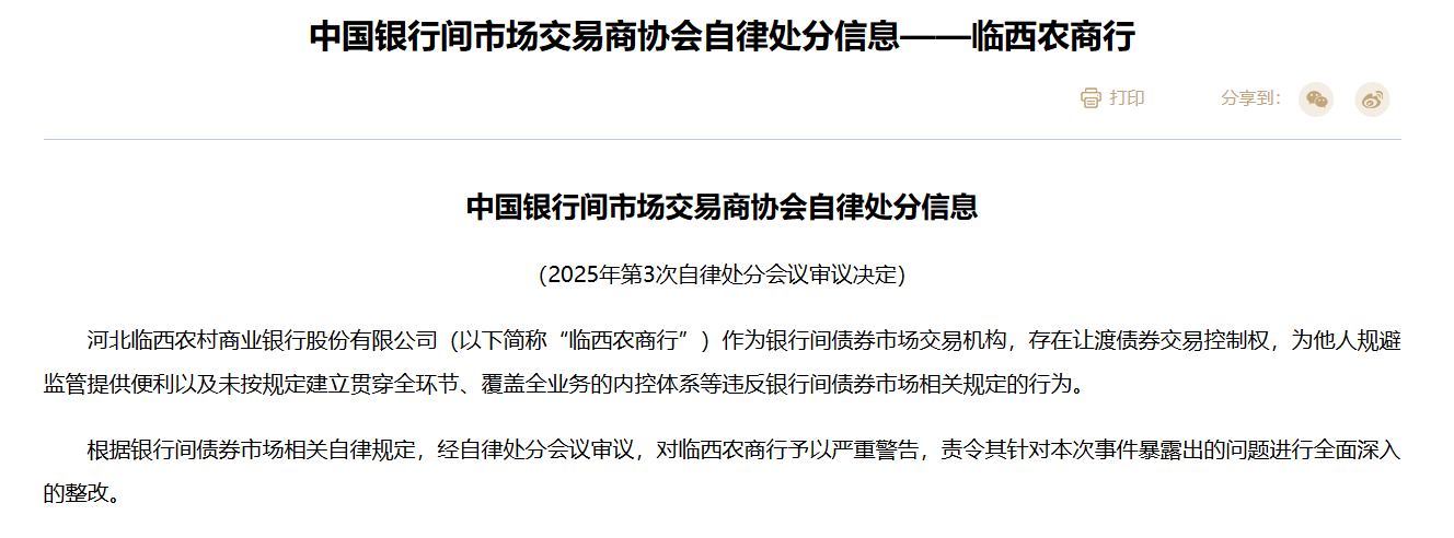 交易商协会:临西农商行存在让渡债券交易控制权等行为 对其予以严重警告