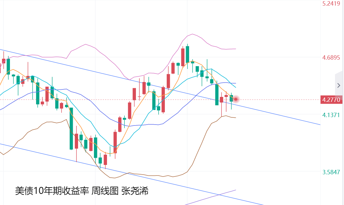 美债10年期收益率,日图持续震荡盘整,未能跌破200日均线支撑,但仍处于今年以来的回落趋势中,空头前景仍保持良好,周图走势也仍处于布林带中轨下方,且偏向开口向下延伸,附图指标也维持空头信号发展,暗示空头仍暂占据一定优势。
